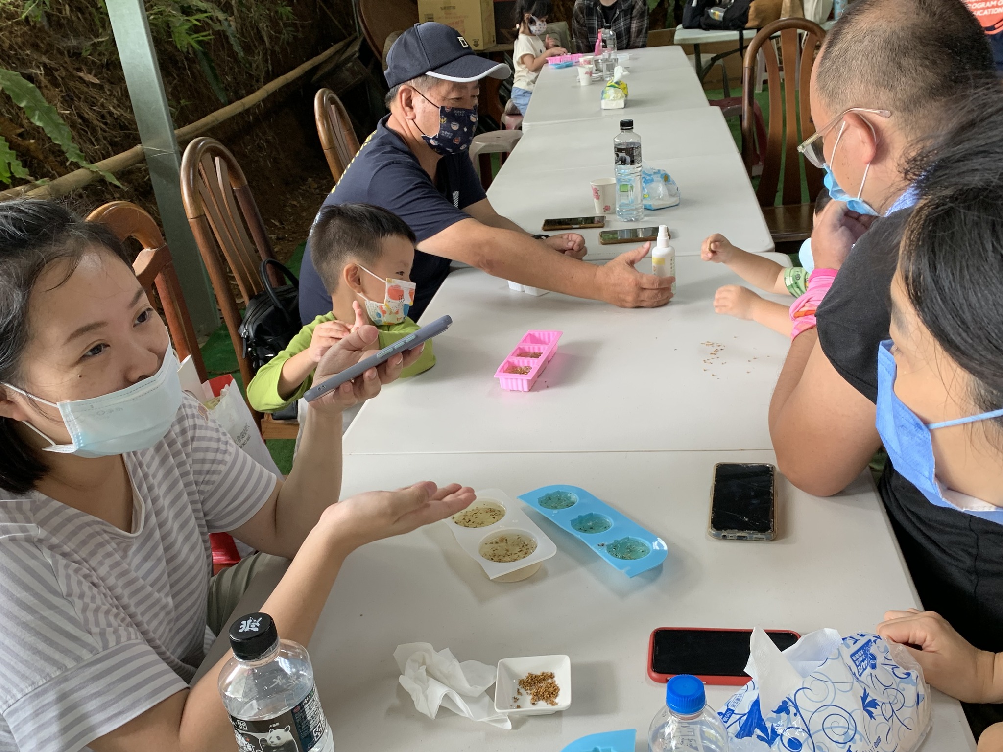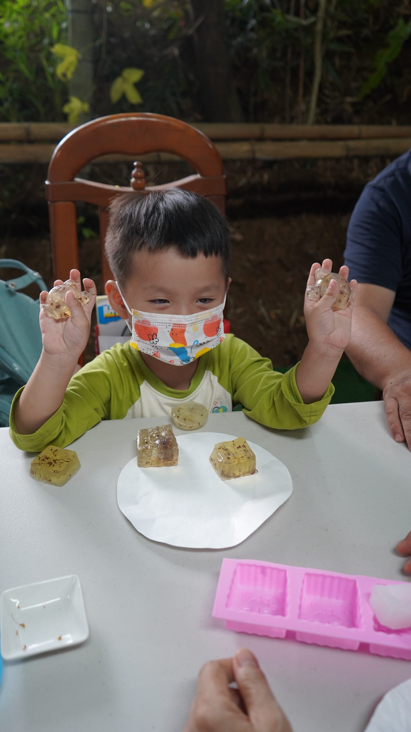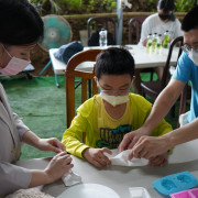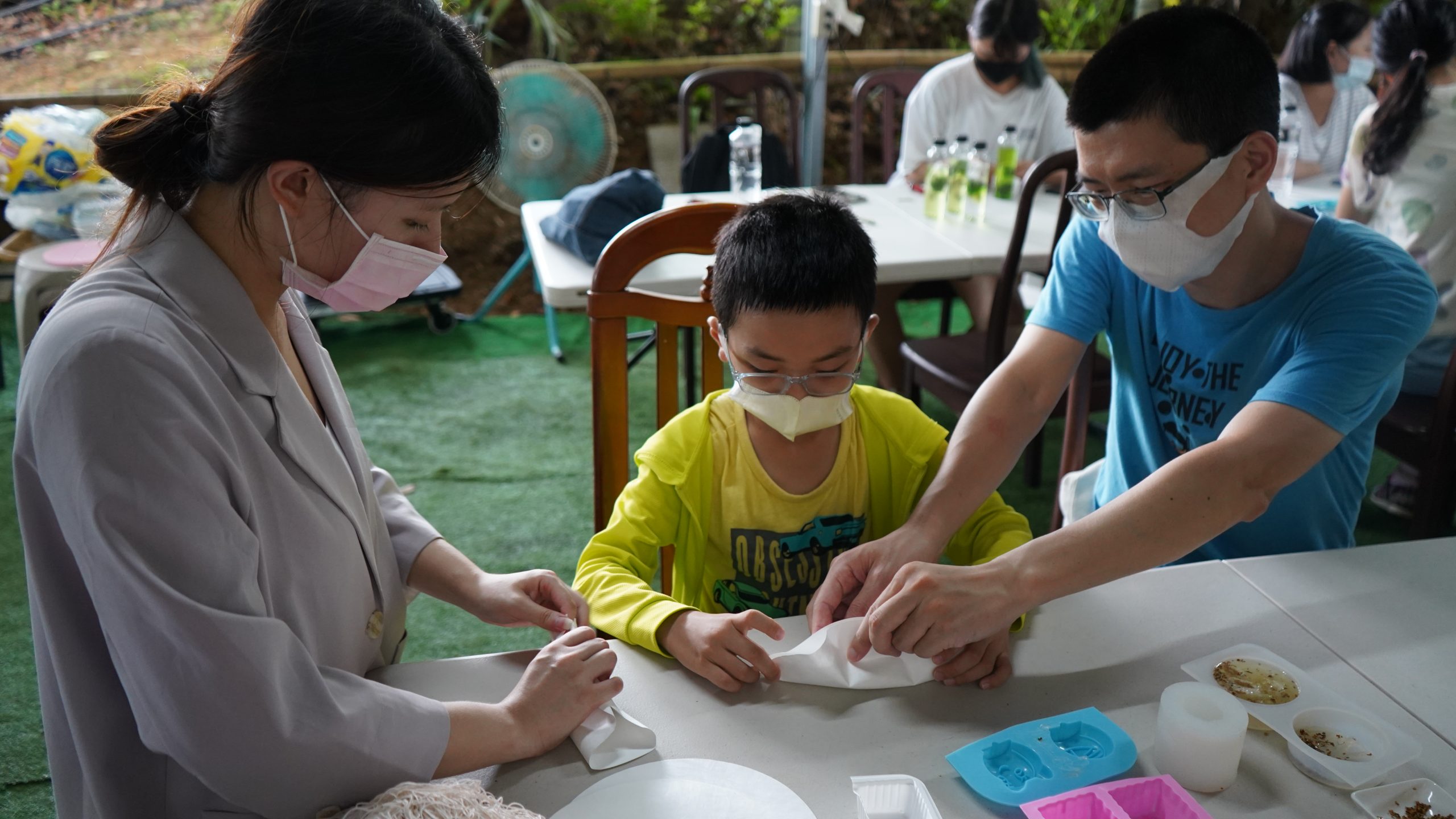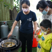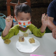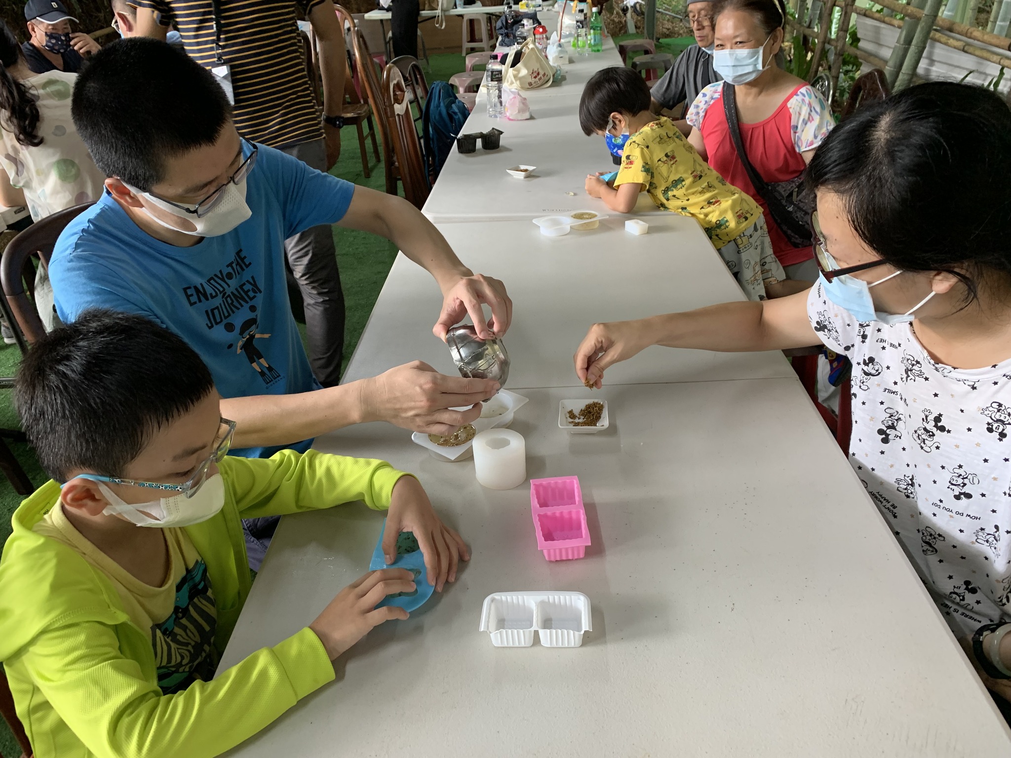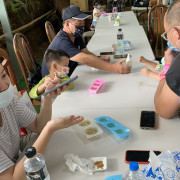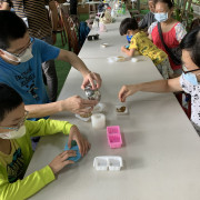 這場工作坊主要是讓親子一起DIY製作環保「柚香手工皂」(2022.8.14)。清華大學修習與參與「社會服務」的同學 – 瑜婷、舒晴兩位講師(同學)示範把甘油皂基在熱煮溶化,然後帶領大家把柚子皮撕成小片丟入熱鍋與甘油皂基一起融合。過程中也解釋製作香皂的基本化學原理。每組親子都選擇了自己喜愛的肥皂模型,有水果造型、哆啦A夢卡通造型、小叮噹卡通造型…等。等待皂化硬了後,小朋友撥開模型,發現一個個透明可愛手工皂跳出,莫不驚喜萬分的喊:哇!好可愛喔!