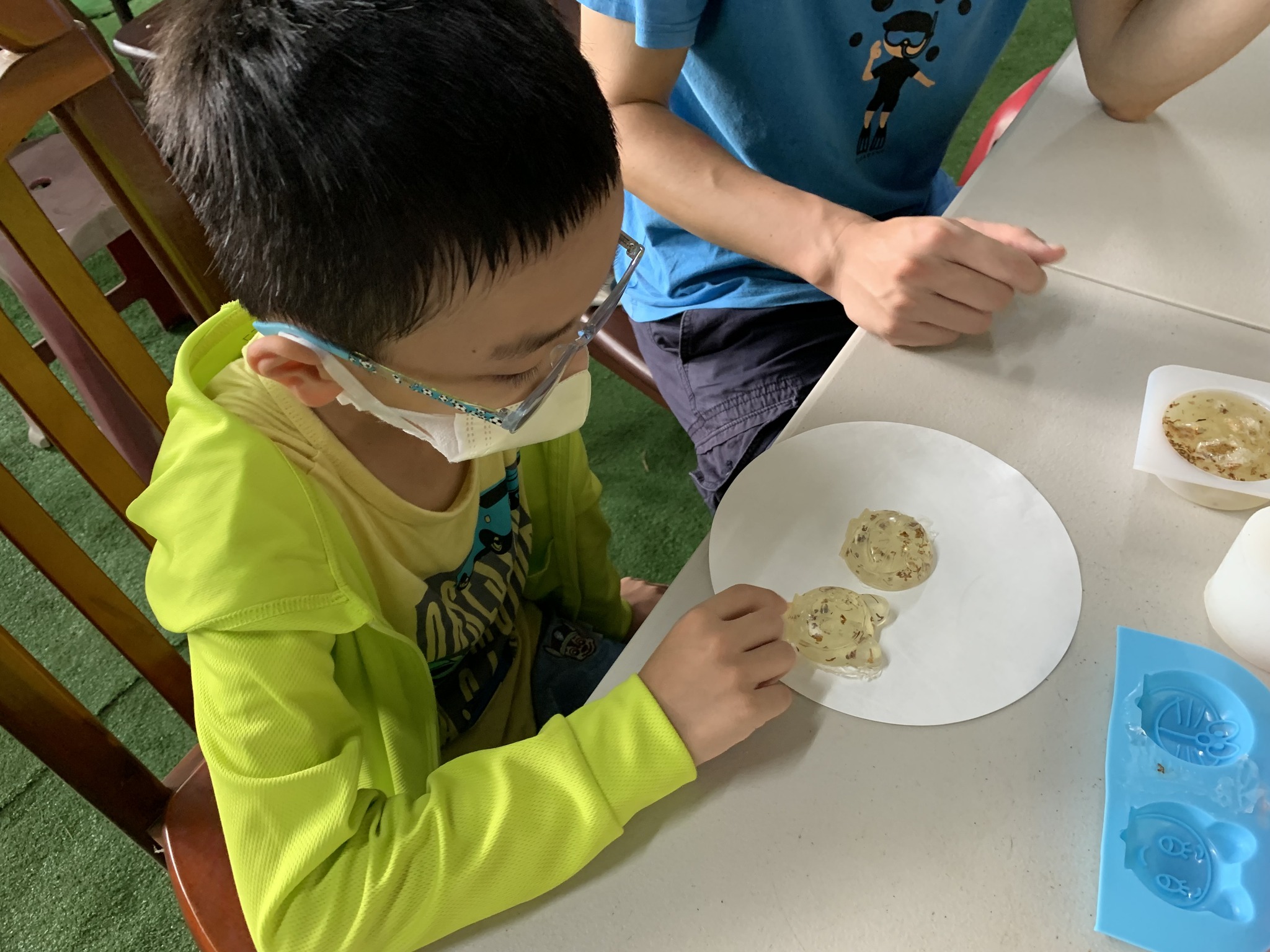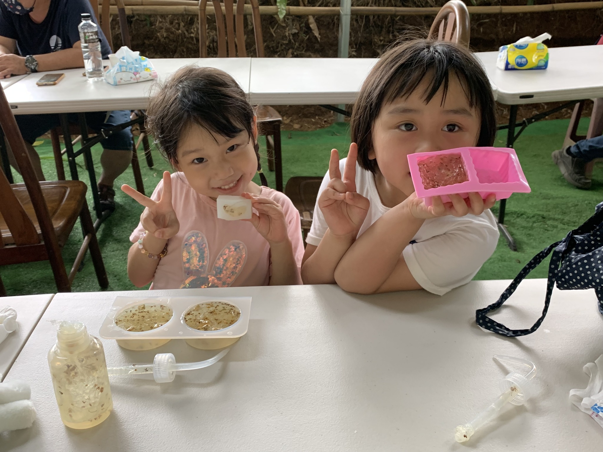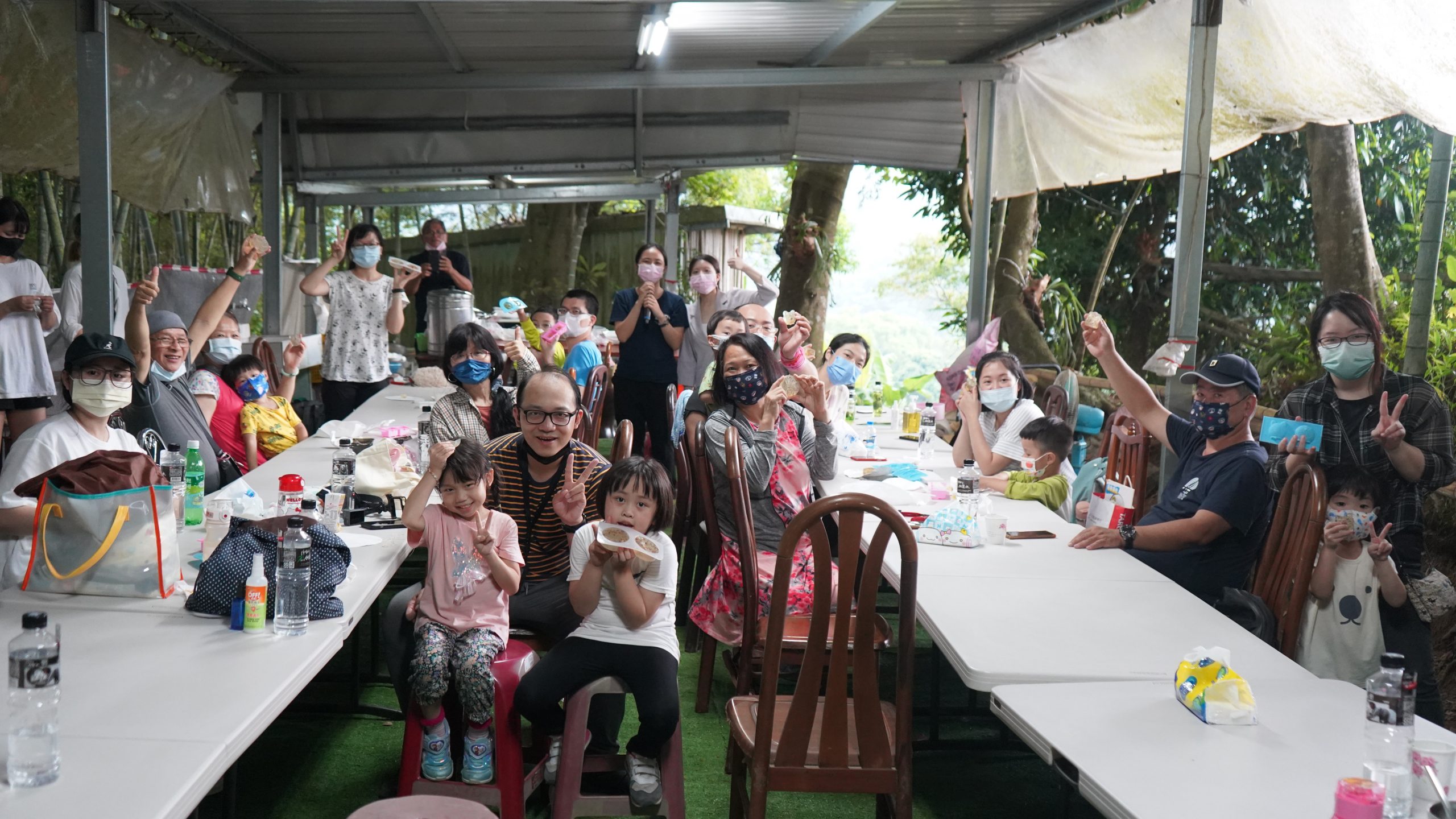 這場工作坊主要是讓親子一起DIY製作環保「柚香手工皂」(2022.8.14)。清華大學修習與參與「社會服務」的同學 – 瑜婷、舒晴兩位講師(同學)示範把甘油皂基在熱煮溶化,然後帶領大家把柚子皮撕成小片丟入熱鍋與甘油皂基一起融合。過程中也解釋製作香皂的基本化學原理。每組親子都選擇了自己喜愛的肥皂模型,有水果造型、哆啦A夢卡通造型、小叮噹卡通造型…等。等待皂化硬了後,小朋友撥開模型,發現一個個透明可愛手工皂跳出,莫不驚喜萬分的喊:哇!好可愛喔!