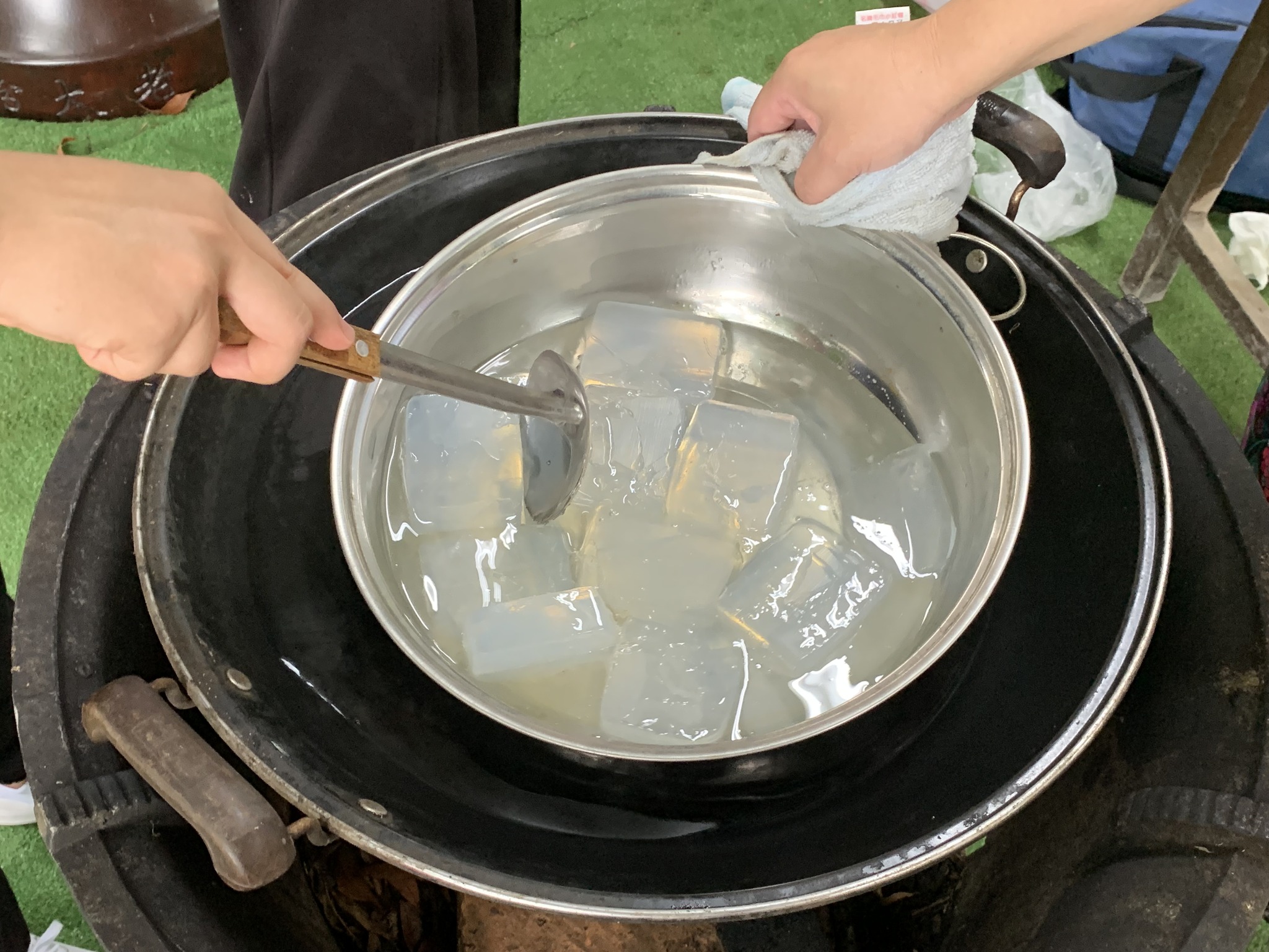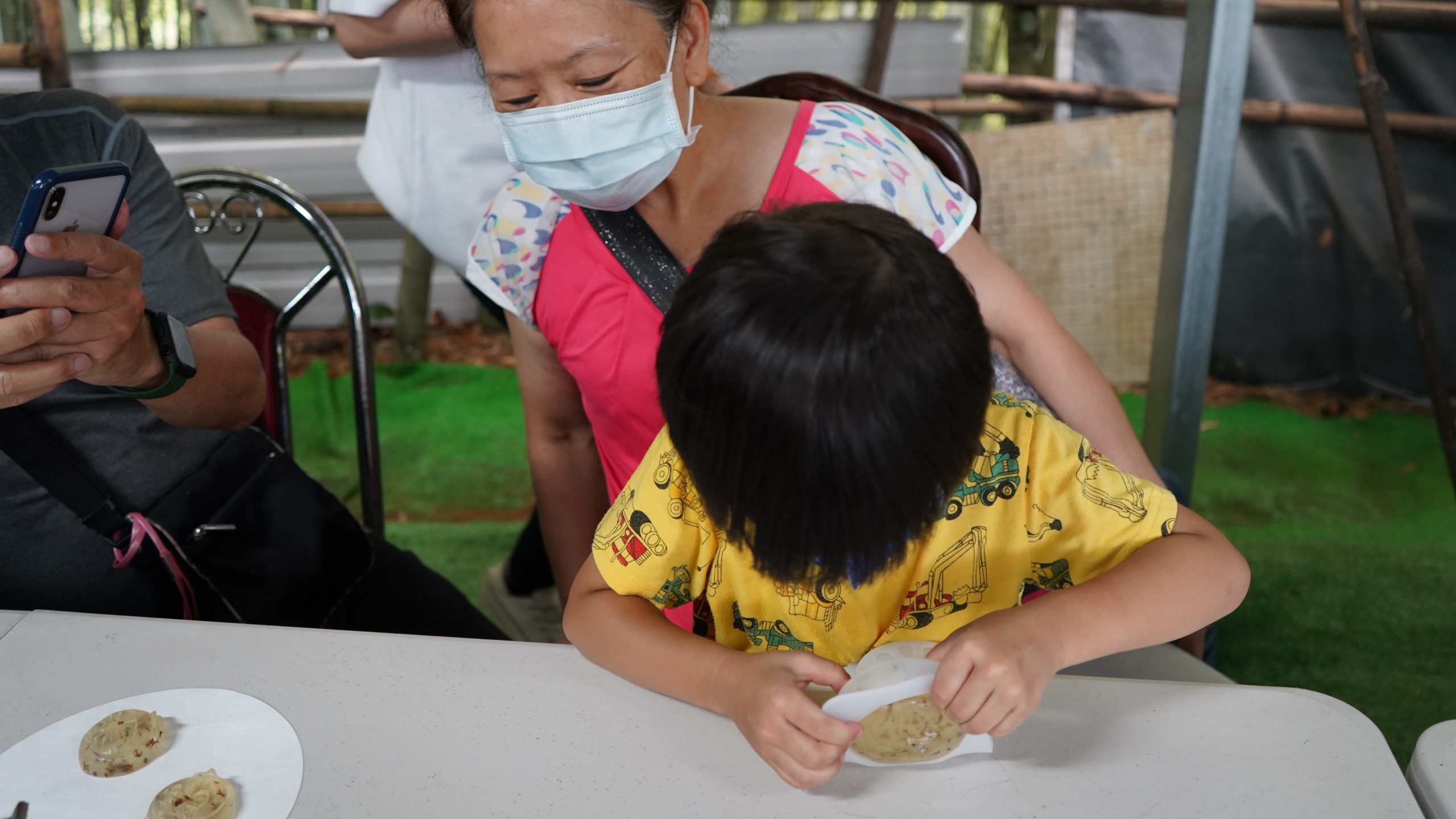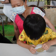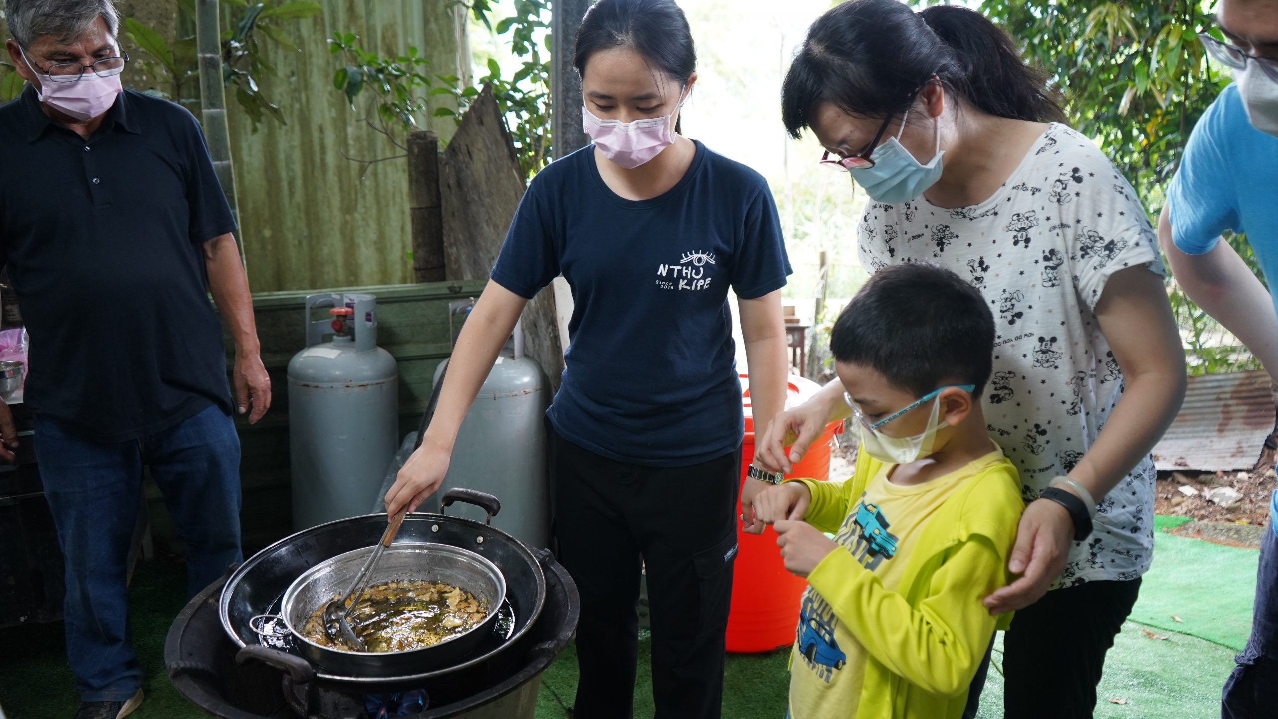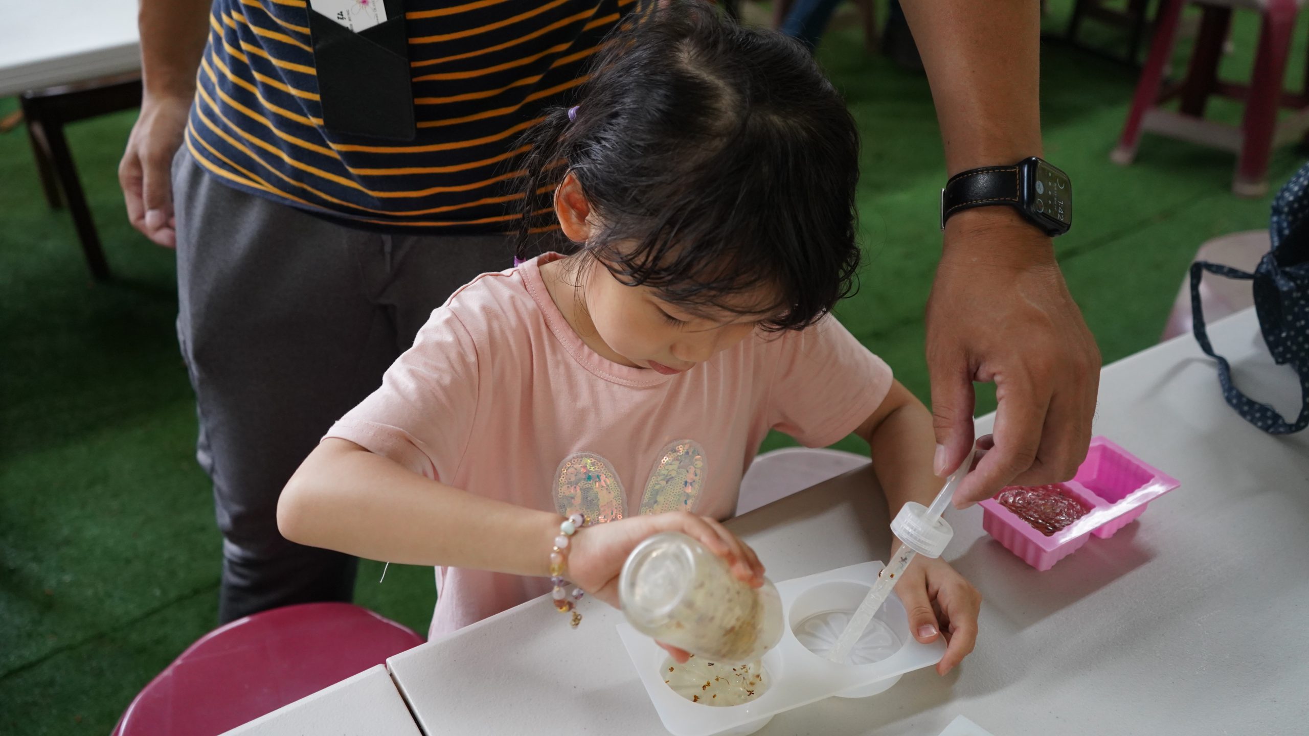 這場工作坊主要是讓親子一起DIY製作環保「柚香手工皂」(2022.8.14)。清華大學修習與參與「社會服務」的同學 – 瑜婷、舒晴兩位講師(同學)示範把甘油皂基在熱煮溶化,然後帶領大家把柚子皮撕成小片丟入熱鍋與甘油皂基一起融合。過程中也解釋製作香皂的基本化學原理。每組親子都選擇了自己喜愛的肥皂模型,有水果造型、哆啦A夢卡通造型、小叮噹卡通造型…等。等待皂化硬了後,小朋友撥開模型,發現一個個透明可愛手工皂跳出,莫不驚喜萬分的喊:哇!好可愛喔!