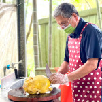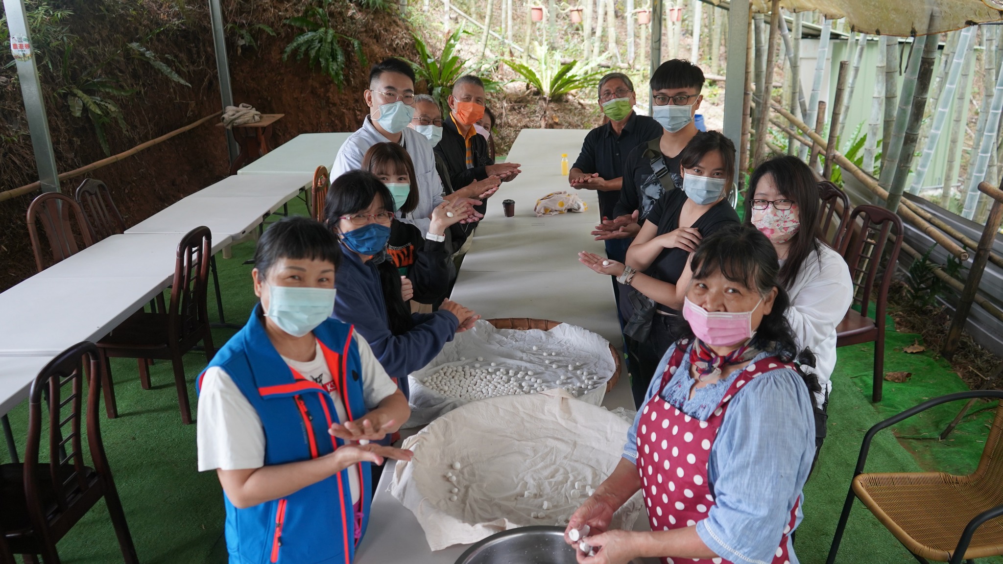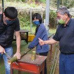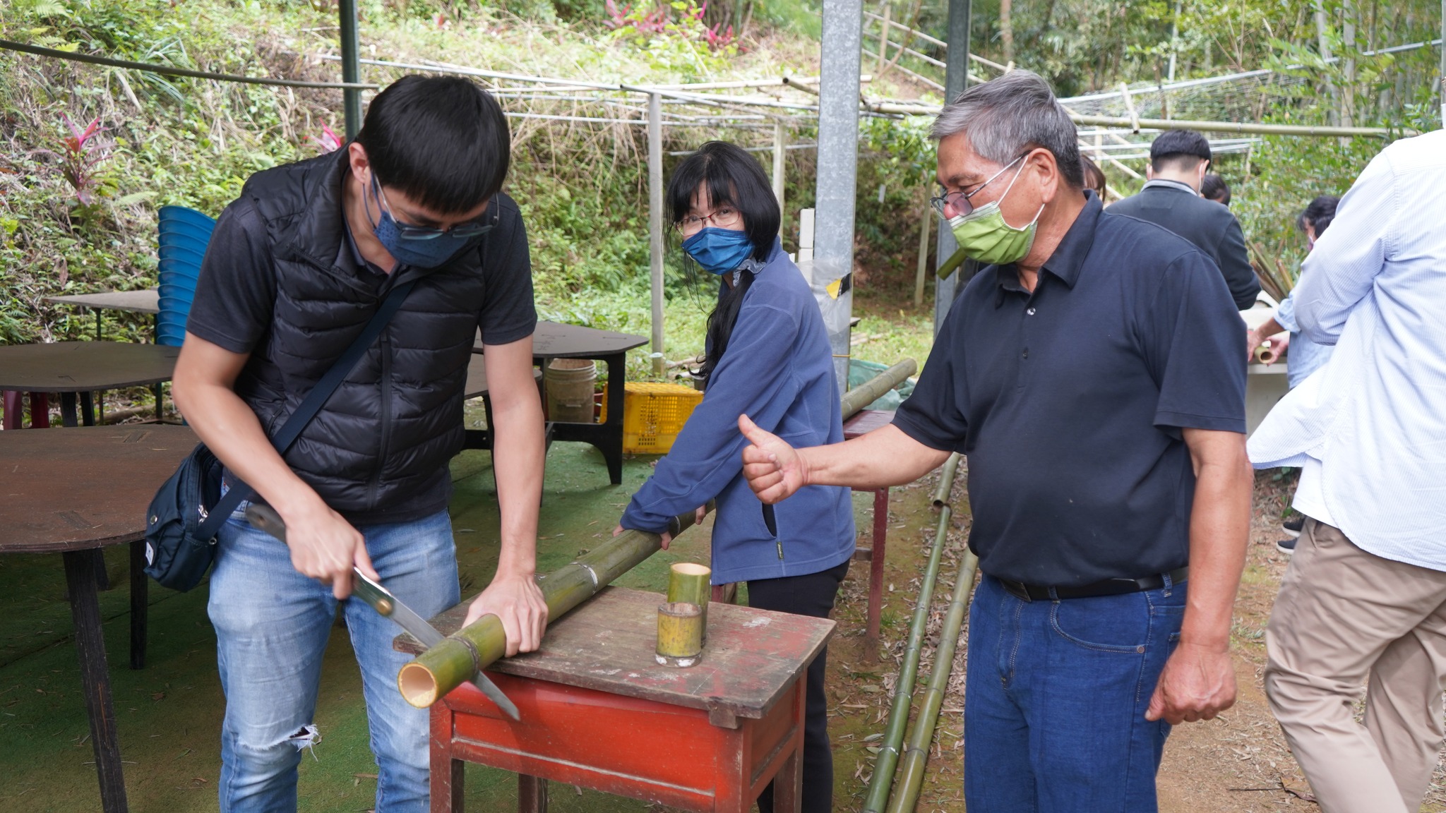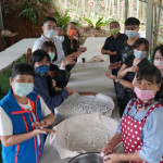 中午楊大哥用在地食材及剛才跑過的山雞等,巧手儲藝的烹煮成美食佳餚,還有大家早上親自搓揉的麻糬,改造成在地客家鹹湯圓、飯後水果有現採的木瓜、日前熟成的香蕉、酸甜到不要不要的黃金百香果等,媲美滿漢全席的在地美饌,賓客大快朵頤的體驗一日農村生活,快樂無暇食農最美。下午課程更創舉,為了倡議節能減碳重視環保,用在地的竹子手做成「環保竹杯」,而過程饒富趣味及意涵,讓一次性的餐具紙杯,離開我們美麗的地球。最佳助教楊小姐表示:在這經營農場並貫徹橫山鄉公所政策:因為「食農教育」蘊含農業永續、糧食安全、全民生活及飲食等相關議題,而在地經濟及農業發展需全民支持,為提升國人對農業及糧食生產系統的「小知識」和對農業重大議題的瞭解,我們用在地小農的「食農教育」拋磚引玉,爬梳小農的土香生活,進而成為每個人生活的實踐,注重個人健康飲食,支持國產農產品,促進在地經濟及農業之發展。